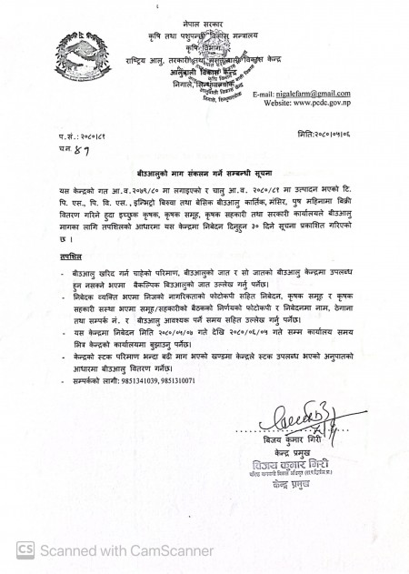 आलु बाली विकास केन्द्र , सिन्धुपाल्चोकद्वारा उत्पादित टि .पि.एस, पि.वि.एस., इन्भिट्रो विरुवा तथा बेसिक बीउआलुको माग संकलन बारे