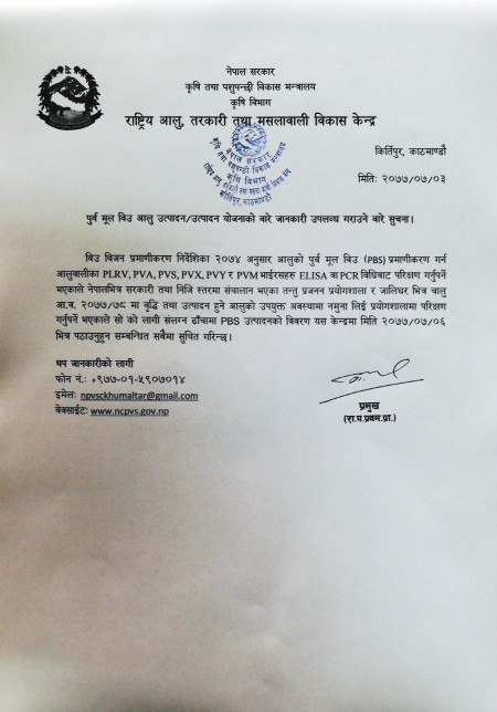 पुर्व मूल विउ आलु उत्पादन-उत्पादन योजना वारे जानकारी उपलव्ध गराउने सम्बन्धमा