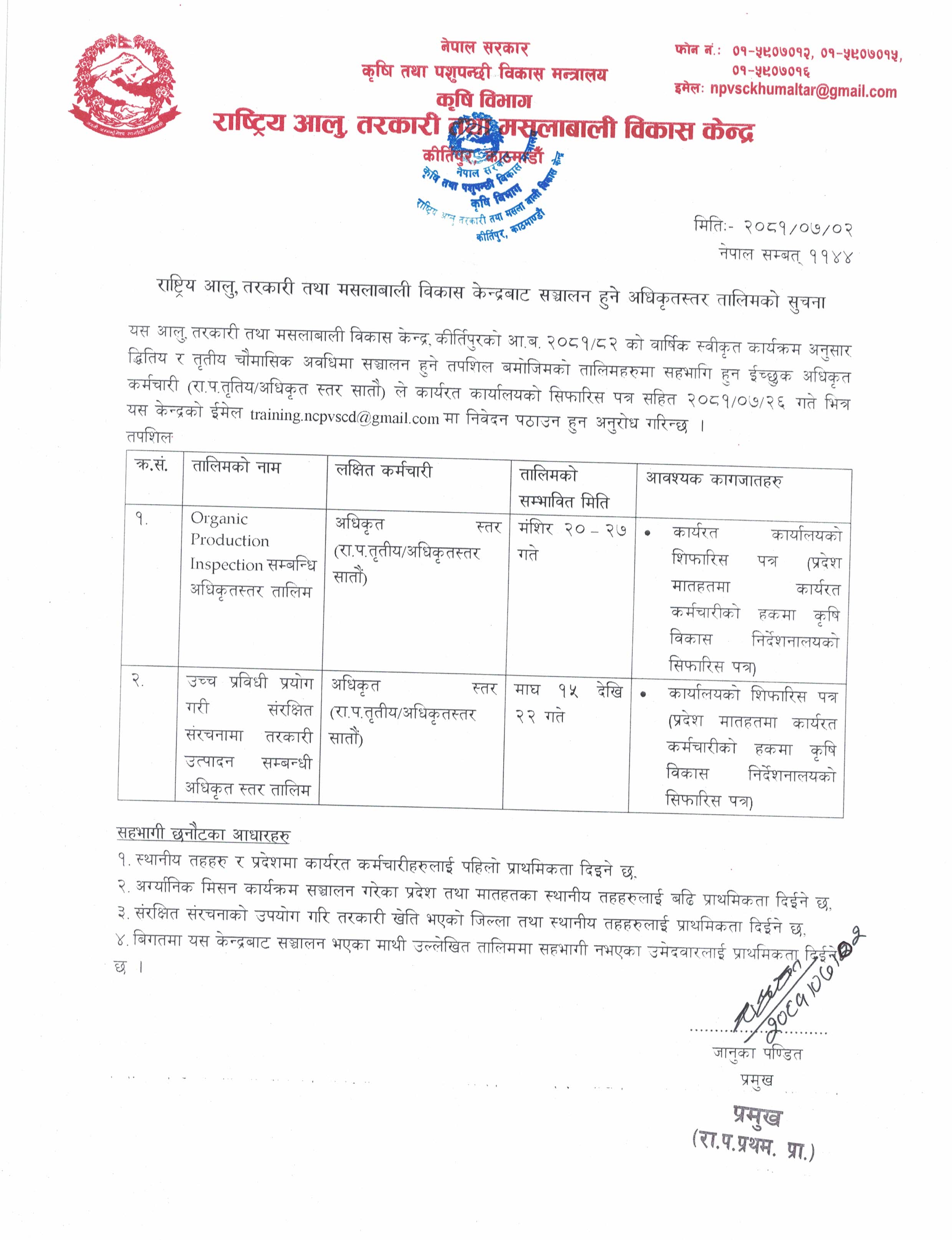 Training notice of NCPVSCD